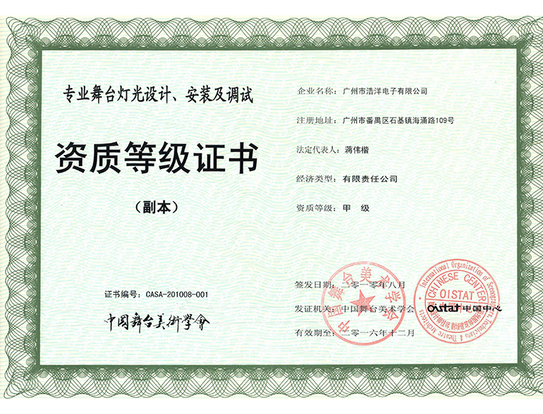 中國演出行業(yè)舞臺(tái)工程企業(yè)技術(shù)資質(zhì)證書(舞臺(tái)燈光壹級)