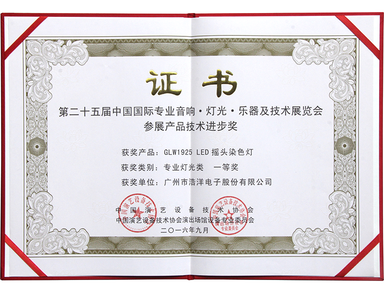 中國演藝設備協會第二十五屆PALM展產品技術進步獎一等獎GLW1925