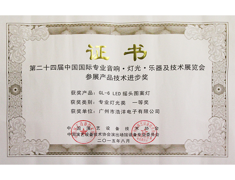 中國演藝設備協會第二十四屆PALM展產品技術進步獎一等獎GL-6