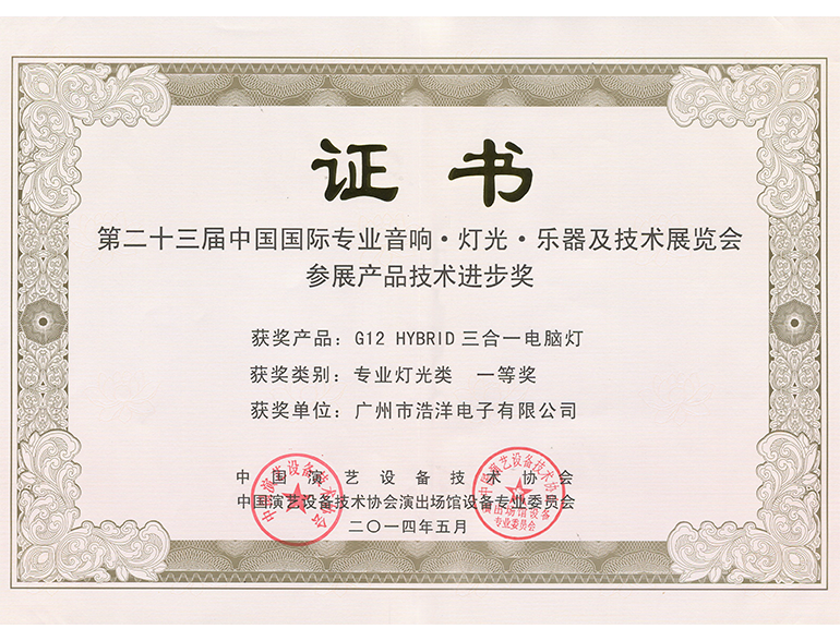 中國演藝設備協會第二十三屆PALM展產品技術進步獎一等獎G12 HYBRID