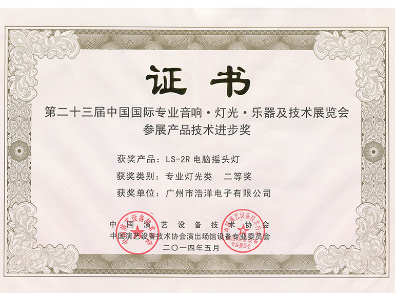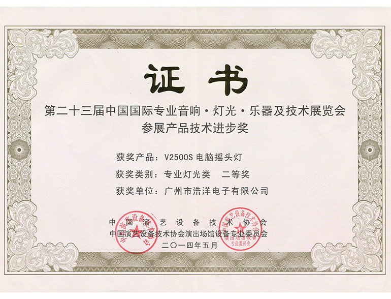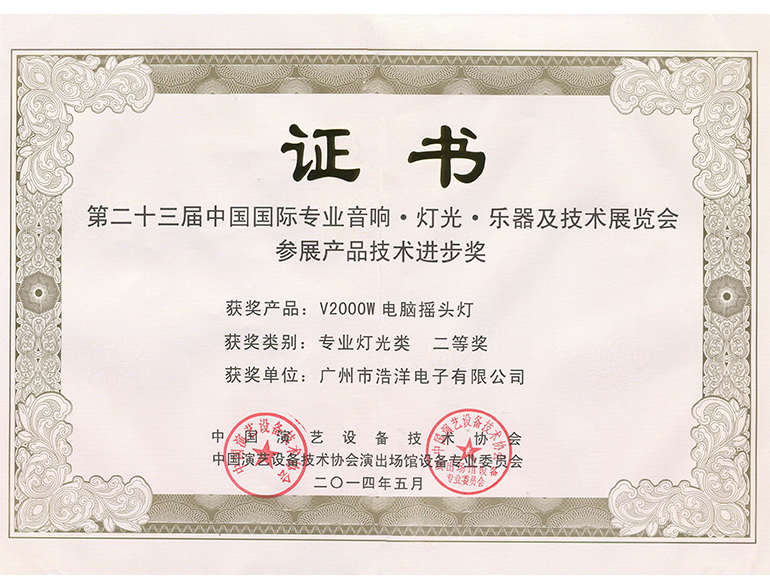 中國演藝設備協會第二十三屆PALM展產品技術進步獎二等獎V2000W