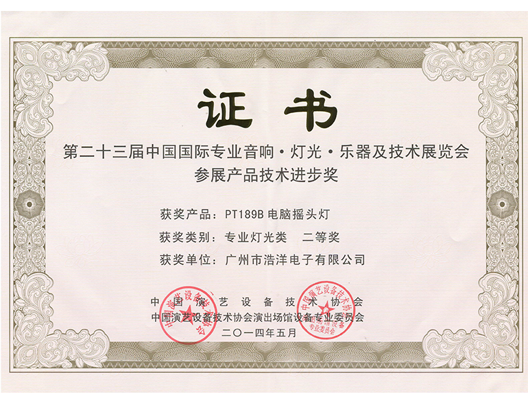中國演藝設備協會第二十三屆PALM展產品技術進步獎二等獎PT189B