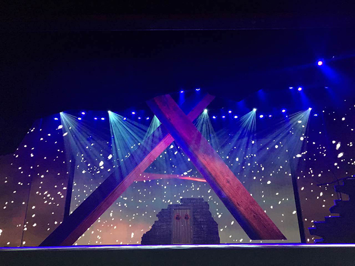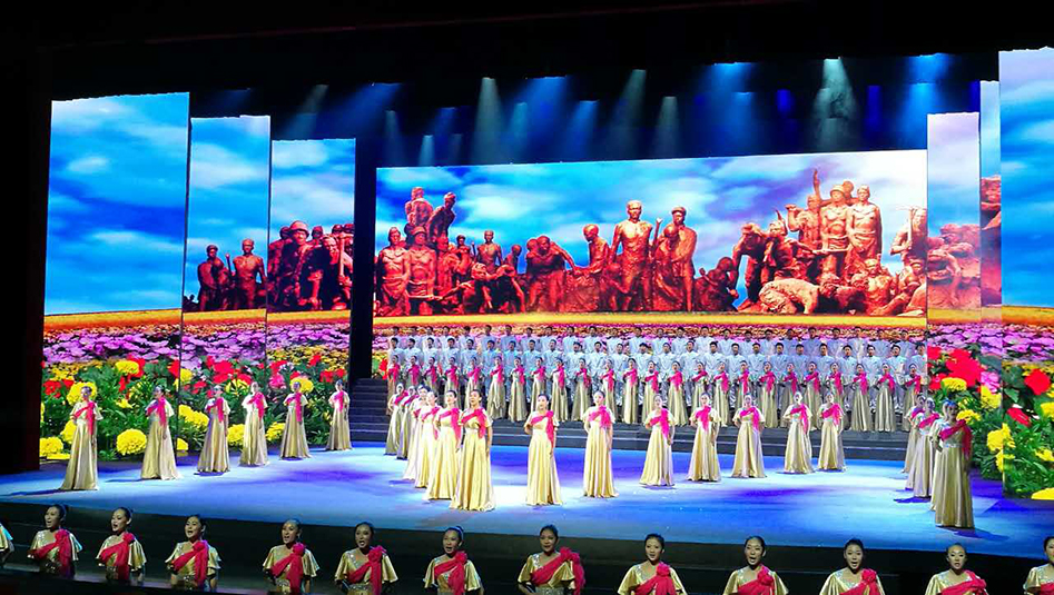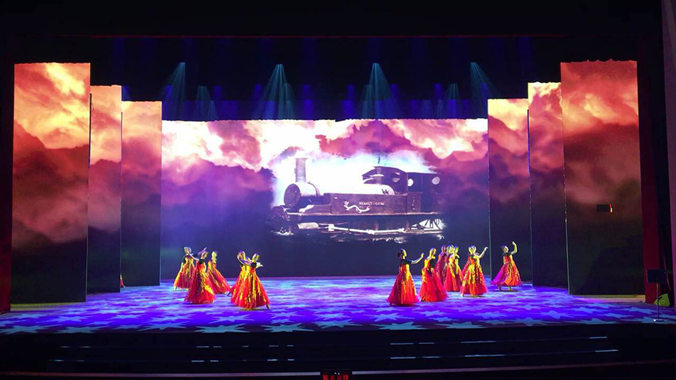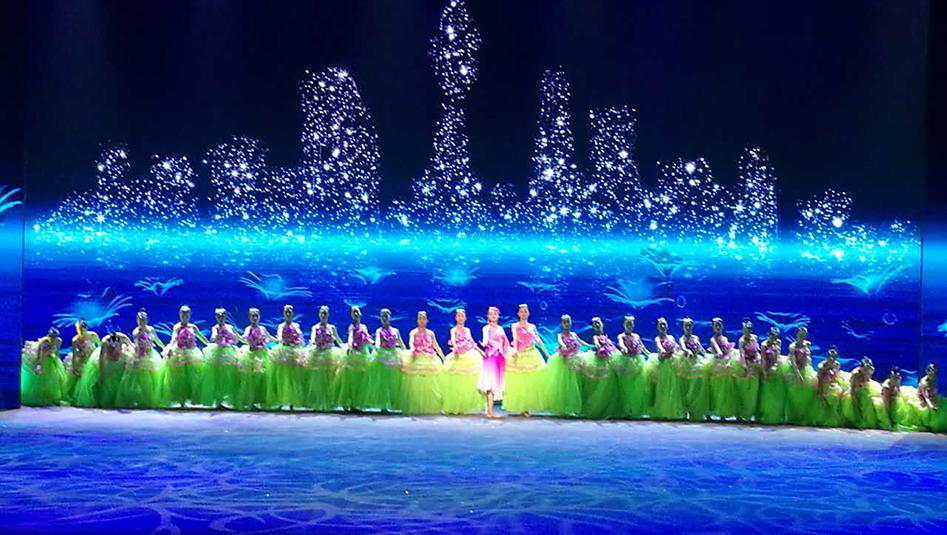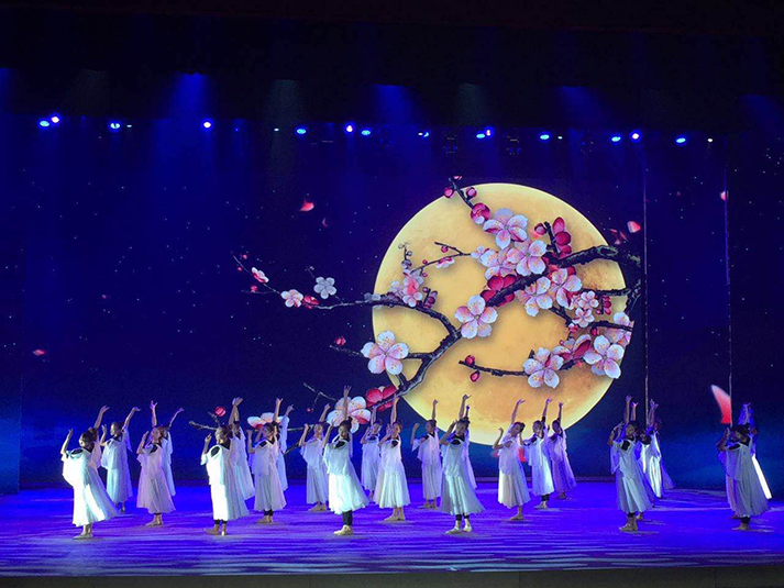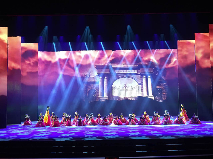"我從舞臺劇的燈光設計思路出發(fā),用沿幕把所有燈具在舞臺上隱藏起來,使觀眾看不見燈具只看見色彩和光線。這次晚會共采用了80臺1500w圖案燈(特寶麗V2500S)、60臺1500w染色燈、120臺光束燈(特寶麗PT320B)、160臺LED燈、40臺切割燈(特寶麗V3000P)以及4臺追光燈(特寶麗FS300M)。切割燈特寶麗V3000P主要做面光使用,用于把舞臺多余的光切掉,使舞臺更干凈更透亮,同時也讓演員和舞美道具等清晰可見。“小鋼炮”浩洋光束燈PT320B主要用于打造炫目的舞臺效果;我在設計中將圖案燈里面的圖案與染色燈的色彩功能充分疊加之后鋪照在舞臺上,這種方式能夠呈現(xiàn)出更加繽紛和絢麗的圖案效果;地流燈和側(cè)光的運用則讓每一位演員都在舞臺上呈現(xiàn)更加立體。
