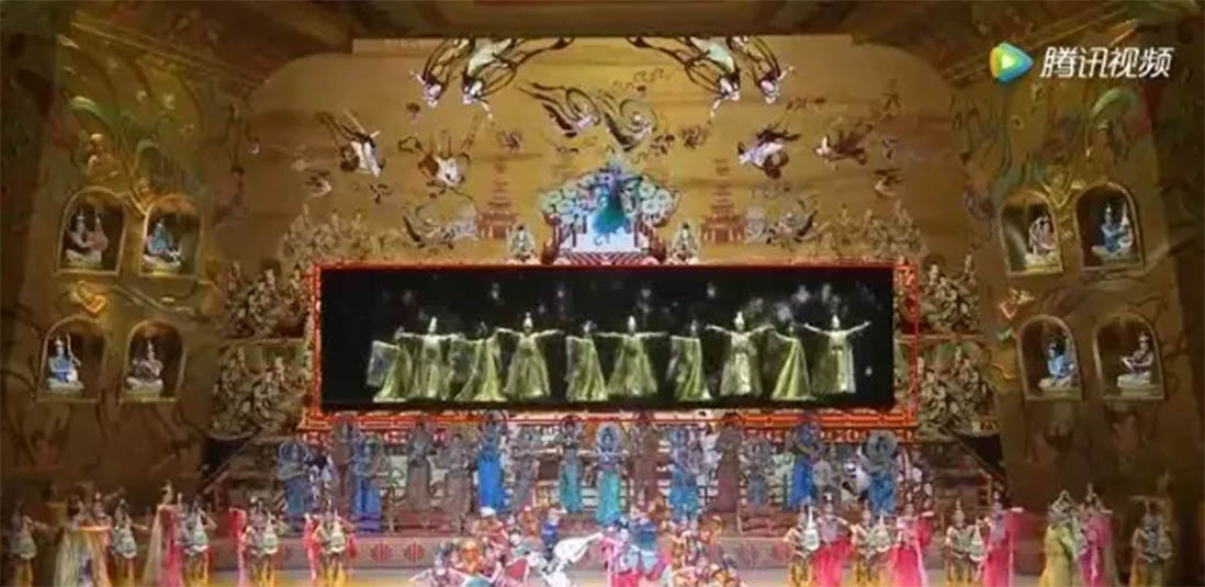 文藝晚會(huì)有效運(yùn)用科技元素,使晚會(huì)的舞美設(shè)計(jì)帶有顯著特色。晚會(huì)多項(xiàng)節(jié)目散發(fā)舞美空間魅力,設(shè)計(jì)師巧妙地把節(jié)目的內(nèi)在意境外化,觀眾也能隨著舞美空間馳騁在想象的旅程中。另外,《千年之約》等節(jié)目中,應(yīng)用了全息投影技術(shù),這也是杭州G20全息技術(shù)的升華應(yīng)用,使壁畫(huà)中的人物栩栩如生,實(shí)現(xiàn)真實(shí)的演員和全息影像交替出現(xiàn),與舞臺(tái)燈光完美結(jié)合,形成3D全息效果,達(dá)到似真似幻的效果。