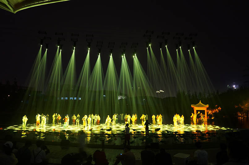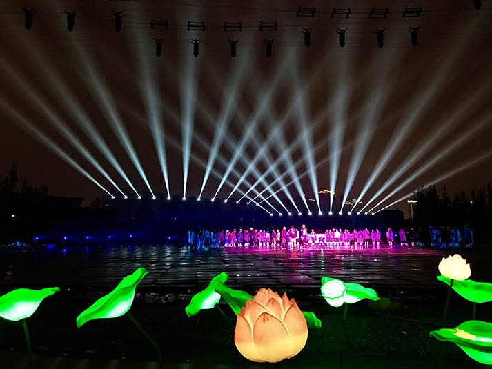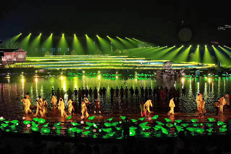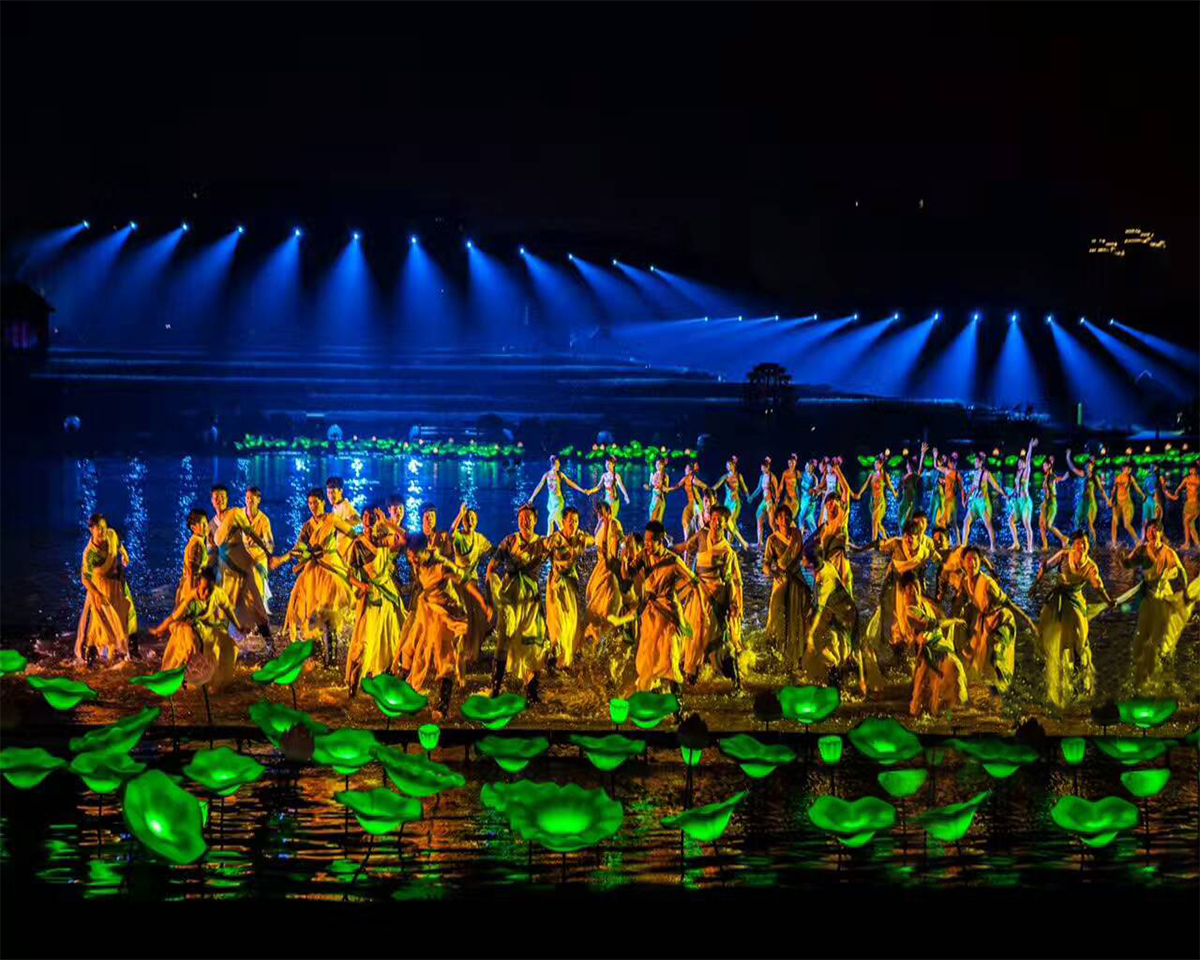 大型田園花火情境實(shí)景演出《瀏陽(yáng)河上》是浩洋團(tuán)隊(duì)繼湖南常德首臺(tái)城市風(fēng)情實(shí)景秀《夢(mèng)回穿紫河》重大燈光工程后的又一力作。該燈光工程共使用浩洋電子旗下特寶麗品牌IP65全能王三合一電腦燈、全能王三合一電腦燈G12 HYBRID、切割燈V3000P、追光燈FS800M、防水固定染色燈OVAL 48D、LED條燈等近1200臺(tái)專業(yè)舞臺(tái)燈。通過(guò)燈光設(shè)計(jì)與演出內(nèi)容的緊密結(jié)合,通過(guò)序曲和三大主題篇章,彰顯其多樣氣質(zhì)。