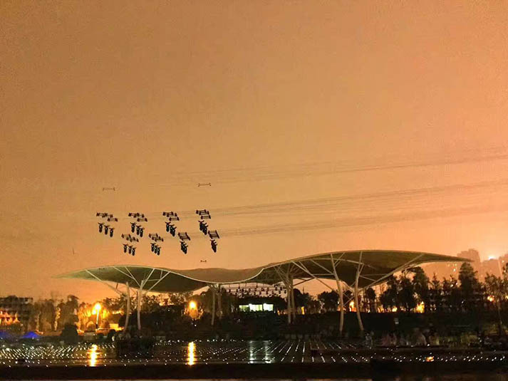 總導(dǎo)演李彥介紹,全劇不僅通過(guò)音、舞、詩(shī)、樂(lè)、頌等多種藝術(shù)載體,還原了瀏陽(yáng)河最美的人、景、民俗和史實(shí),更有多處創(chuàng)新:視覺(jué)方面,首次將瀏陽(yáng)焰火融入實(shí)景演出;燈光特效方面,更是大膽采用了今年央視春晚全球首次使用的“天外飛燈”。繼2017央視春晚桂林分會(huì)場(chǎng)的“天外飛燈”表演秀驚艷全球后,浩洋電子“天外飛燈-FOS360”系統(tǒng)強(qiáng)勢(shì)助陣大型田園花火情境實(shí)景演出《瀏陽(yáng)河上》,再次實(shí)現(xiàn)專業(yè)舞臺(tái)電腦燈飛行演出,打造飛行燈光舞臺(tái)。浩洋電子通過(guò)極富創(chuàng)意的燈光設(shè)計(jì)和表現(xiàn)力十足的燈光應(yīng)用,生動(dòng)演繹了瀏陽(yáng)河的精神風(fēng)貌。