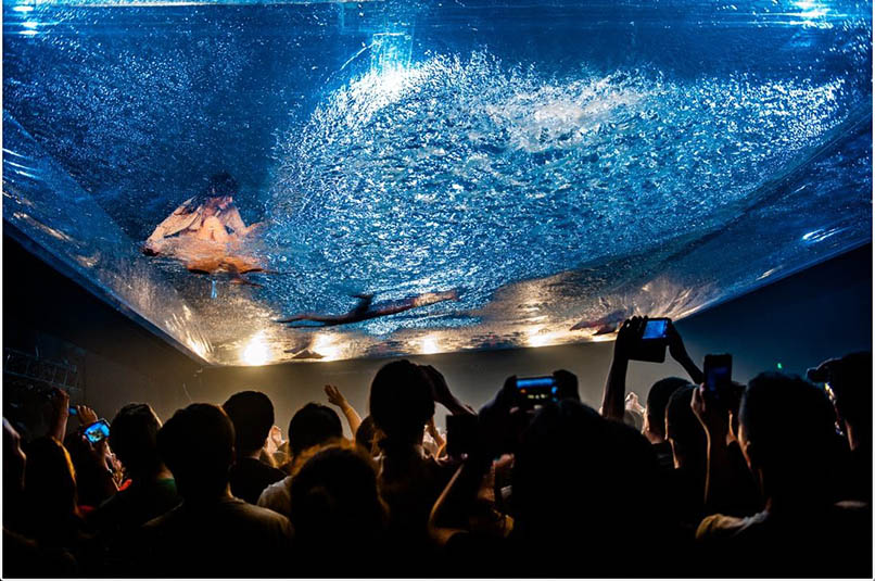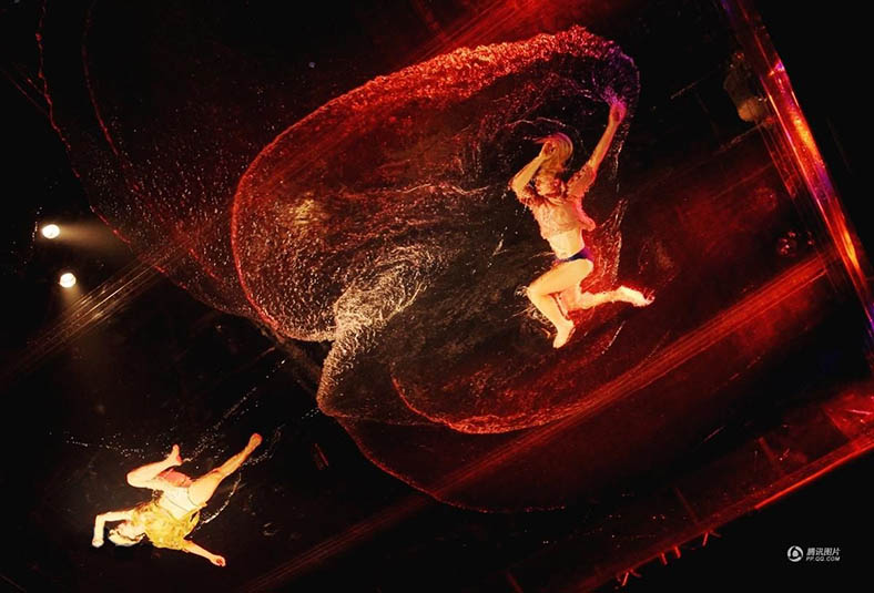 《極限震撼》中有一幕演出是4位女舞者在一個裝了一層水的薄膜上濕身熱舞,水膜高高架起,觀眾稍微一抬頭就能觀賞到女舞者的曼妙舞姿,更允許觀眾們與舞者們零距離接觸。這種現(xiàn)場互動,中國觀眾相對西方觀眾更為含蓄內斂,對此,舞者Laila表示現(xiàn)場他們會用特有的方式去調動觀眾的情緒。