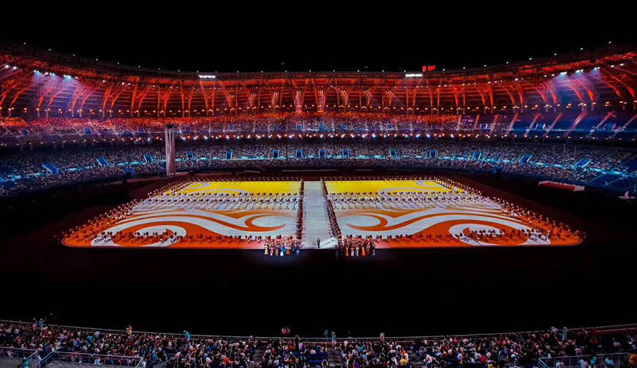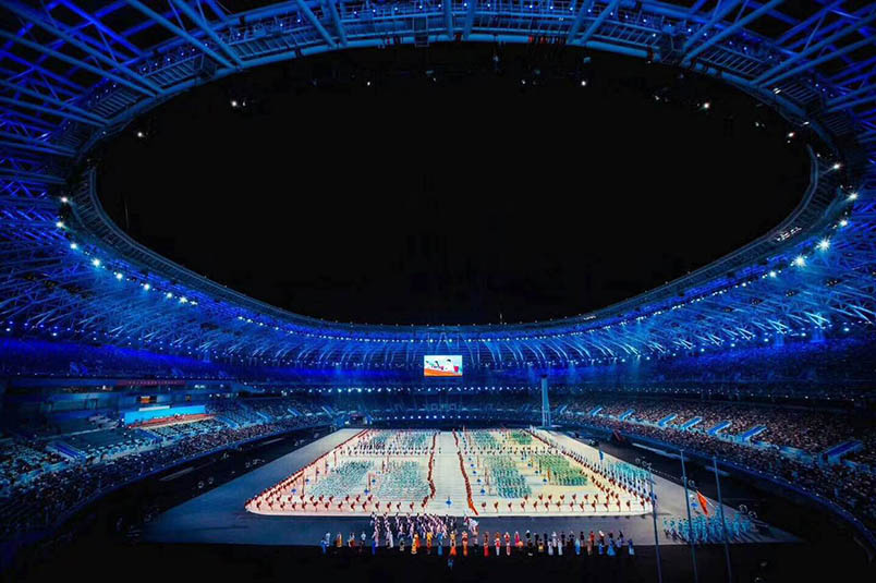 開幕式的亮點(diǎn),一是3D地面投影和人完美配合的視覺效果;二是體育和群眾元素的相結(jié)合;三是以天津元素講述中國故事、展示中國氣派。這其中,最大亮點(diǎn)是開幕式上全程全屏激光投影的使用,加上與表演者的動態(tài)有機(jī)結(jié)合,以及與場外高大建筑燈光秀的合成,讓本屆全運(yùn)會的開幕式在畫面上呈現(xiàn)出如夢如幻的美妙感覺。