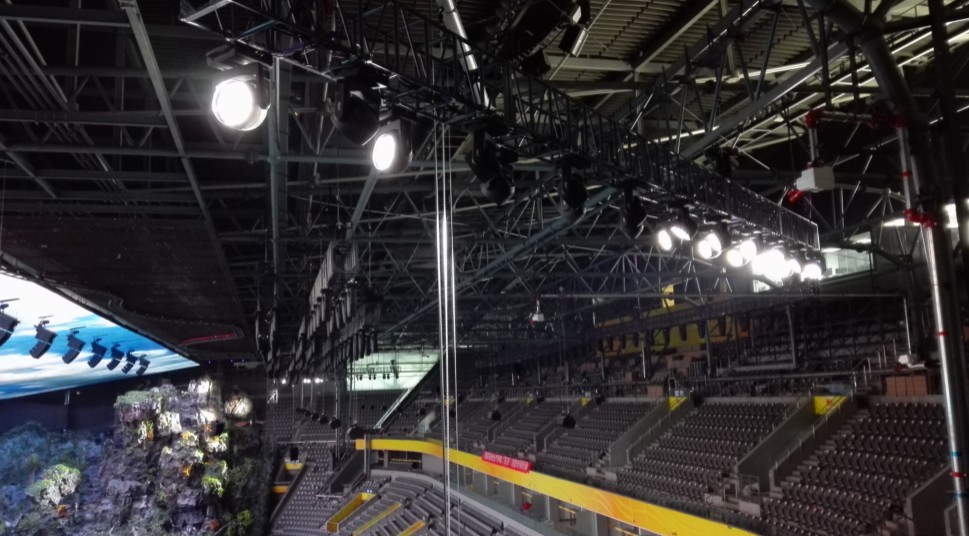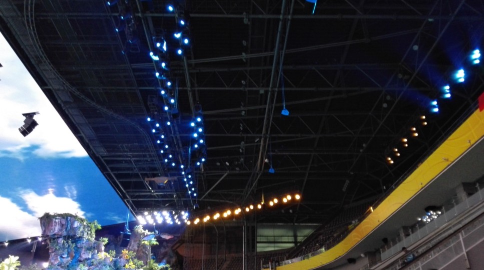 為更真實的反應恐龍世界的自然環(huán)境,《遠去的恐龍》將6000㎡高清LED巨幕組成舞臺的環(huán)幕背景和天空穹頂,這一創(chuàng)作突破了舞臺空間的枷鎖,在國家體育館這一密閉場館內,開辟了恐龍世界深遠無際的遠景和天空。而在觀眾席以外的場館空間,《遠去的恐龍》構建了表面積達11000㎡巨大的高度仿生的山、水、林木實體場景,將恐龍世界的地容、地貌完美地搬進了國家體育館。