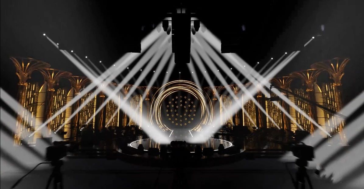作為本季舞美的情懷加分項(xiàng),極具節(jié)目標(biāo)識(shí)性的圓環(huán)赫然矗立中央,在全新加入的流線燈光的營(yíng)造下,更具超現(xiàn)代科技氛圍。而圓環(huán)兩邊,順次排開(kāi)十二根金色珠光圓柱,柱體之間陳列的旋轉(zhuǎn)體則是本季創(chuàng)新的重點(diǎn)。該旋轉(zhuǎn)體分為三面,其中兩面為亞克力三角細(xì)柱,柱上貼有LED數(shù)碼條,當(dāng)歌手演唱時(shí),旋轉(zhuǎn)體可作為渲染燈光的介質(zhì),承接多種曲風(fēng)的氛圍效果;另外一面則為矩形燈陣。當(dāng)浩洋燈光亮起時(shí),貫徹了一如既往的高端視感,打造了新一輪的視覺(jué)盛宴,為觀眾帶來(lái)璀璨奪目的視覺(jué)享受。