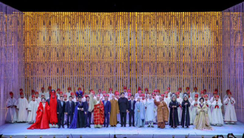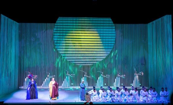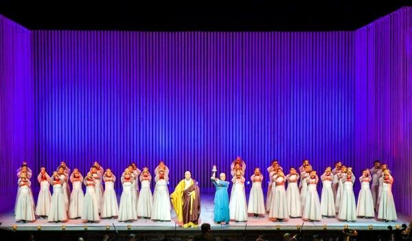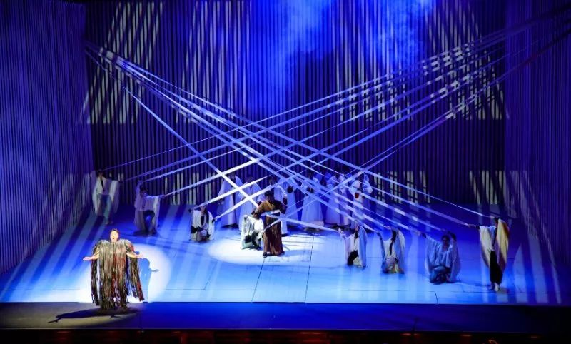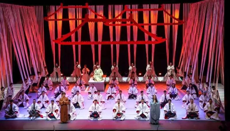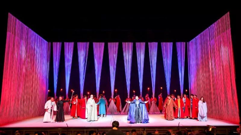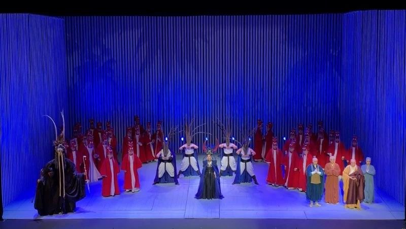 《鑒真東渡》運(yùn)用歌劇這一國(guó)際通識(shí)的藝術(shù)表達(dá)話語(yǔ),配合有感染力的表演,富有創(chuàng)意的舞美燈光設(shè)計(jì),生動(dòng)、立體的人物架構(gòu),在遵循歌劇藝術(shù)規(guī)律的基礎(chǔ)上,創(chuàng)造性地將江蘇民歌元素和佛教音樂(lè)的旋律融入其中,讓歌劇更富有地域特色,呈現(xiàn)出不同于純粹西方歌劇的風(fēng)格,展現(xiàn)出東方所特有的歷史厚重感與人文風(fēng)貌。