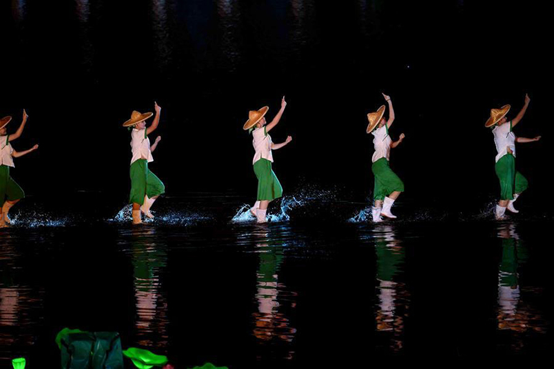 由于實(shí)景演出的舞美要求不能破壞大自然的原始形態(tài),因此現(xiàn)場對視覺效果的塑造都押在了燈光創(chuàng)作上,由于現(xiàn)場表演規(guī)模宏大,尤其是在水面上染色,要做到色彩單純,光線分布均勻且具備足夠的亮度,同時(shí)保證遠(yuǎn)景、近景的清晰可見,給觀眾帶去強(qiáng)烈的視覺感受。