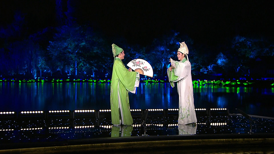 不同于傳統(tǒng)舞臺,利用西湖的自然水面作為表演場地也給《最憶是杭州》文藝晚會(huì)的光位設(shè)計(jì)帶來了不小的挑戰(zhàn),現(xiàn)場干凈、有力的面光和側(cè)光等光位的運(yùn)用,使得被照物體清晰可見的同時(shí)又塑造了較好的人物輪廓。