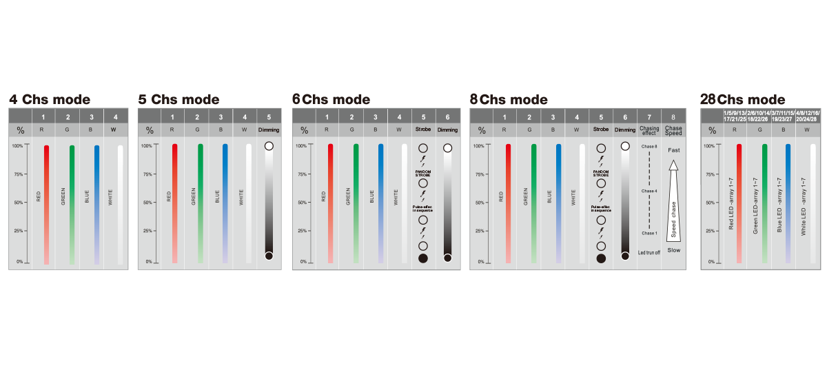 5個通道模式:4/5/6/8/28個國際標(biāo)準(zhǔn)DMX512 通道