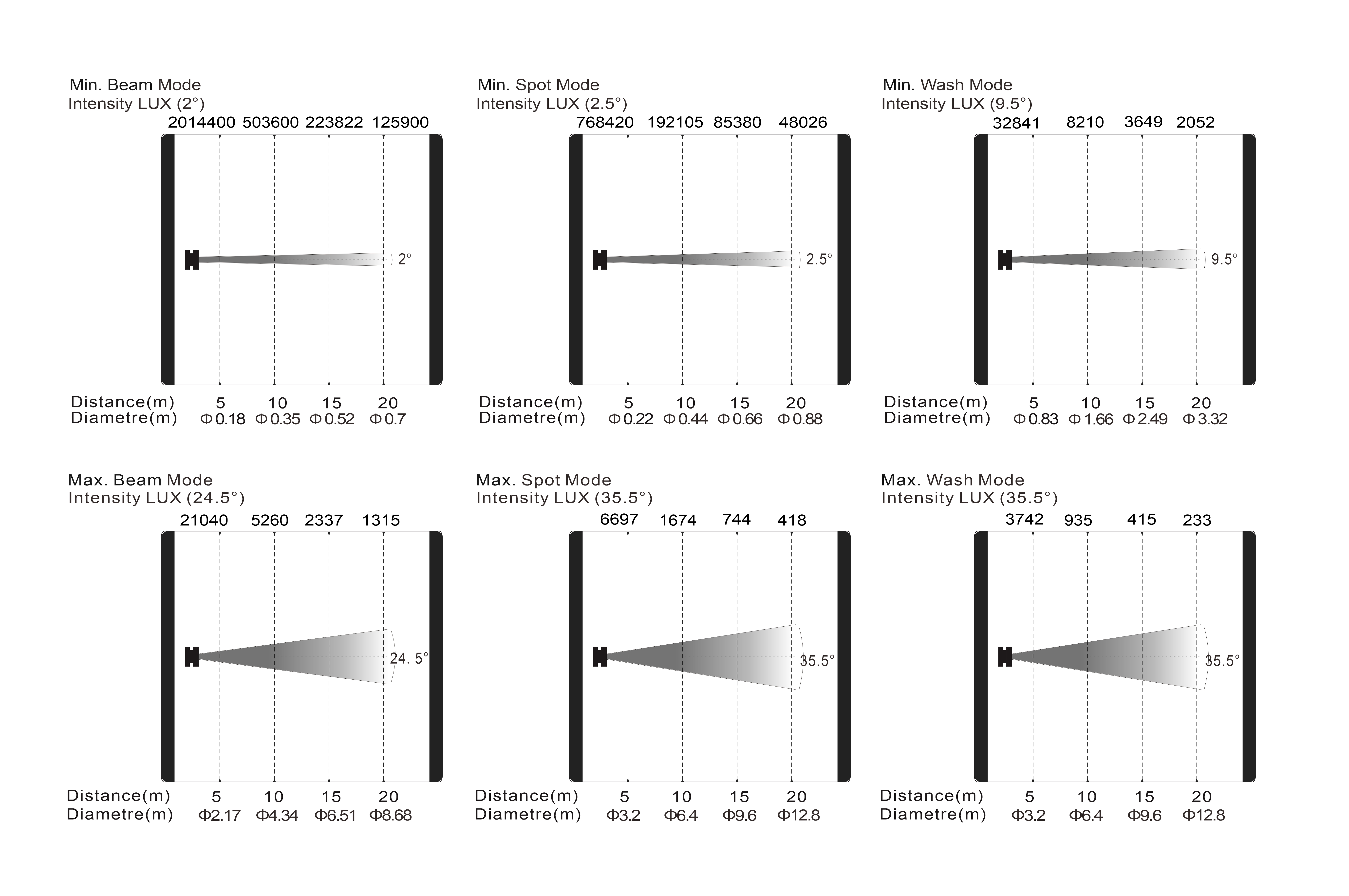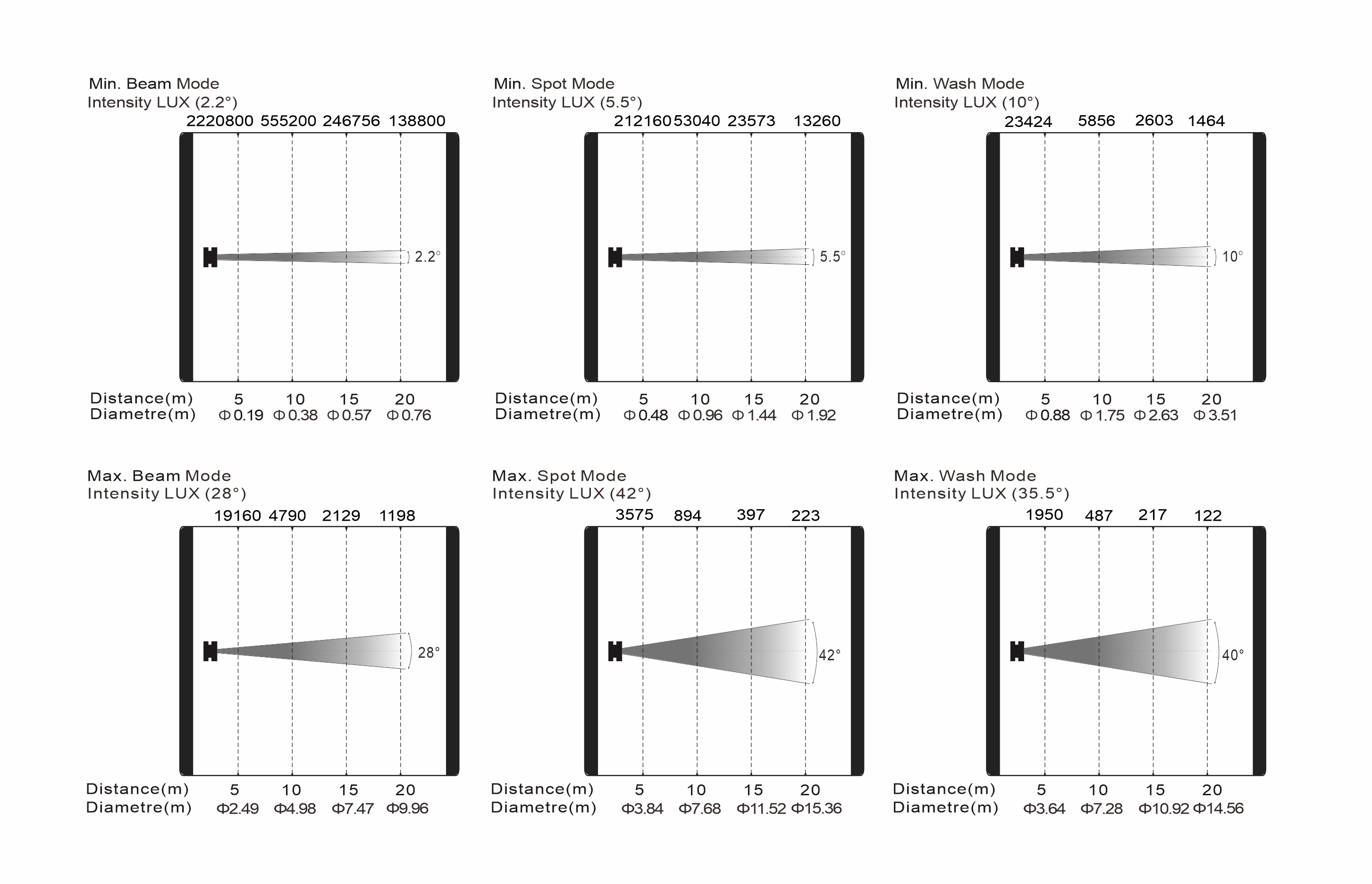 放大:光束模式:2.2°- 28°;圖案模式:5.5°-42°;染色模式:10°-40°